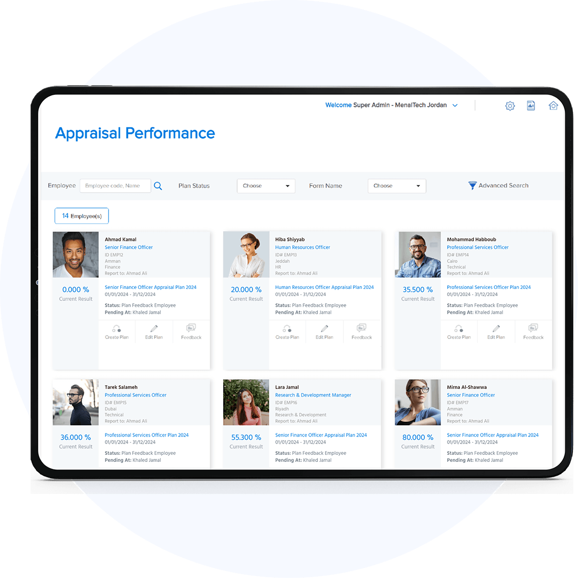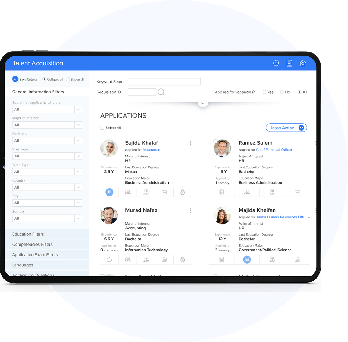 الآن یمكنك عرض الوظائف وتوصیفاتها ومتابعة الطلبات بشكل رقمي للتمكن من عمل دراسات سریعة ومطابقات للمرشحین الأنسب للمهارات المطلوبة. وبعد تعیین الموظف، ینتقل بشكل تلقائي لبرنامج التأهیل.